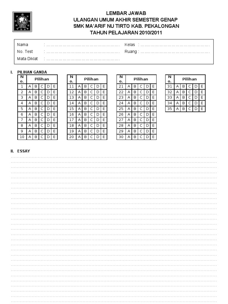 Contoh format lembar jawaban ujian pilihan ganda 50 nomor.