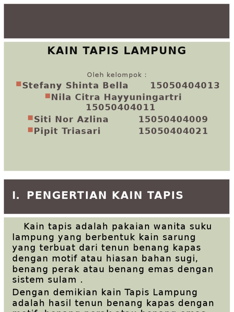 Latar belakang kain tapis lampung kain tapis adalah salah satu jenis kerajinan tradisional masyarakat lampung dalam menyelaraskan kehidupannya baik terhadap lingkungan maupun sang pencipta alam semesta. Hingga saat ini, kain tapis masih dibuat secara tradisional. Agar kain tenun tapis bisa tahan lama, hindarkan kain dari sengatan sinar matahari secara langsung. Penggunaan kain tapis juga tidak bisa sembarangan, tergantung siapa yang menggunakan dan acara yang digelar. (salah satu motif kain tapis sulam tangan) kain tapis ini biasanya digunakan pada bagian pinggang ke bawah layaknya sarung oleh wanita suku lampung.